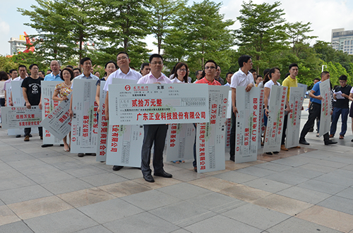 2015年6月30日上午,2015年“廣東扶貧濟困日暨東莞慈善日”公益活動開幕式在東莞市會議大廈廣場隆重舉行。東莞市委市政府,各鎮街組織代表,各愛心企業代表,武警官兵代表,各社會公益社團代表等出席了活動開幕式。廣東正業科技股份有限公司(以下簡稱:正業科技)作為活動的踴躍參與和支持單位,應邀并委派代表出席了開幕式,現場展示了公司捐贈的20萬元支票。